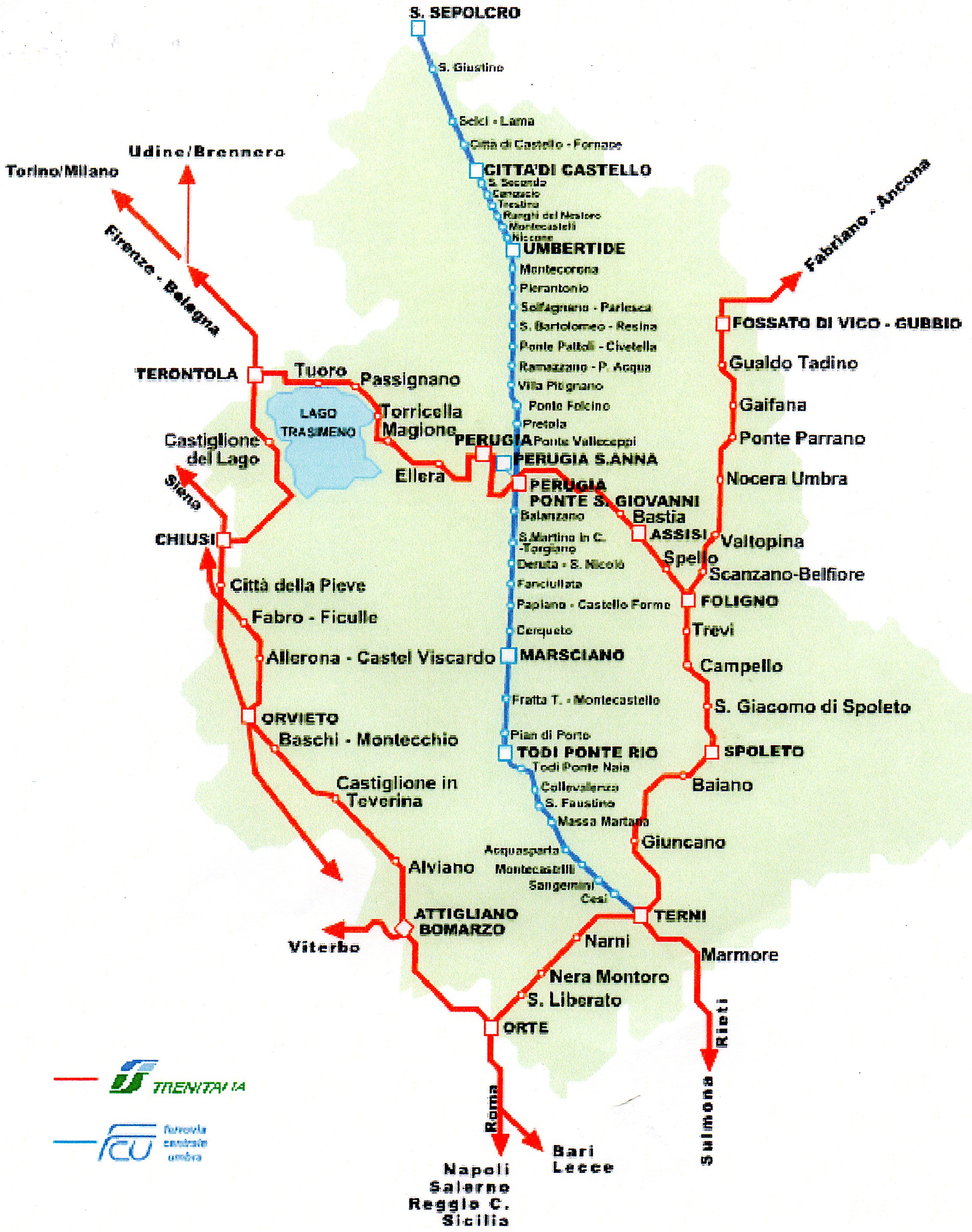 La direttrice Milano Roma passa a fianco del lago Trasimeno sia con la così detta “linea lenta” sia con la linea A.V. – La connessione con tali linee potrebbe derivare da un nuovo tracciato che va da Ellera a Chiusi (in parte già esistito fino alla centrale elettrica di Pietrafitta e poi dismesso).